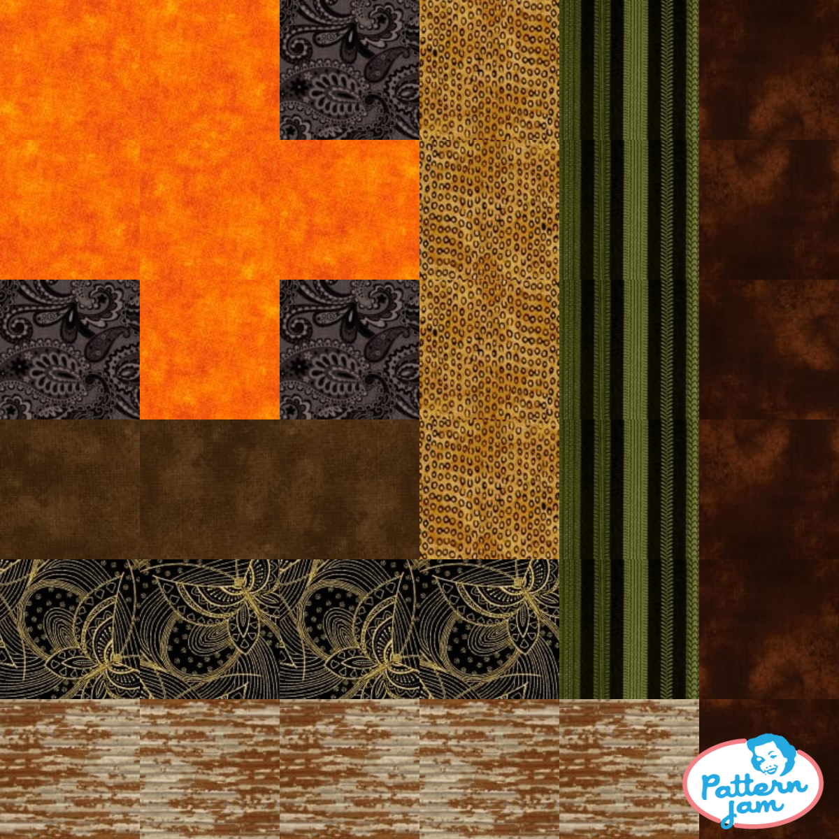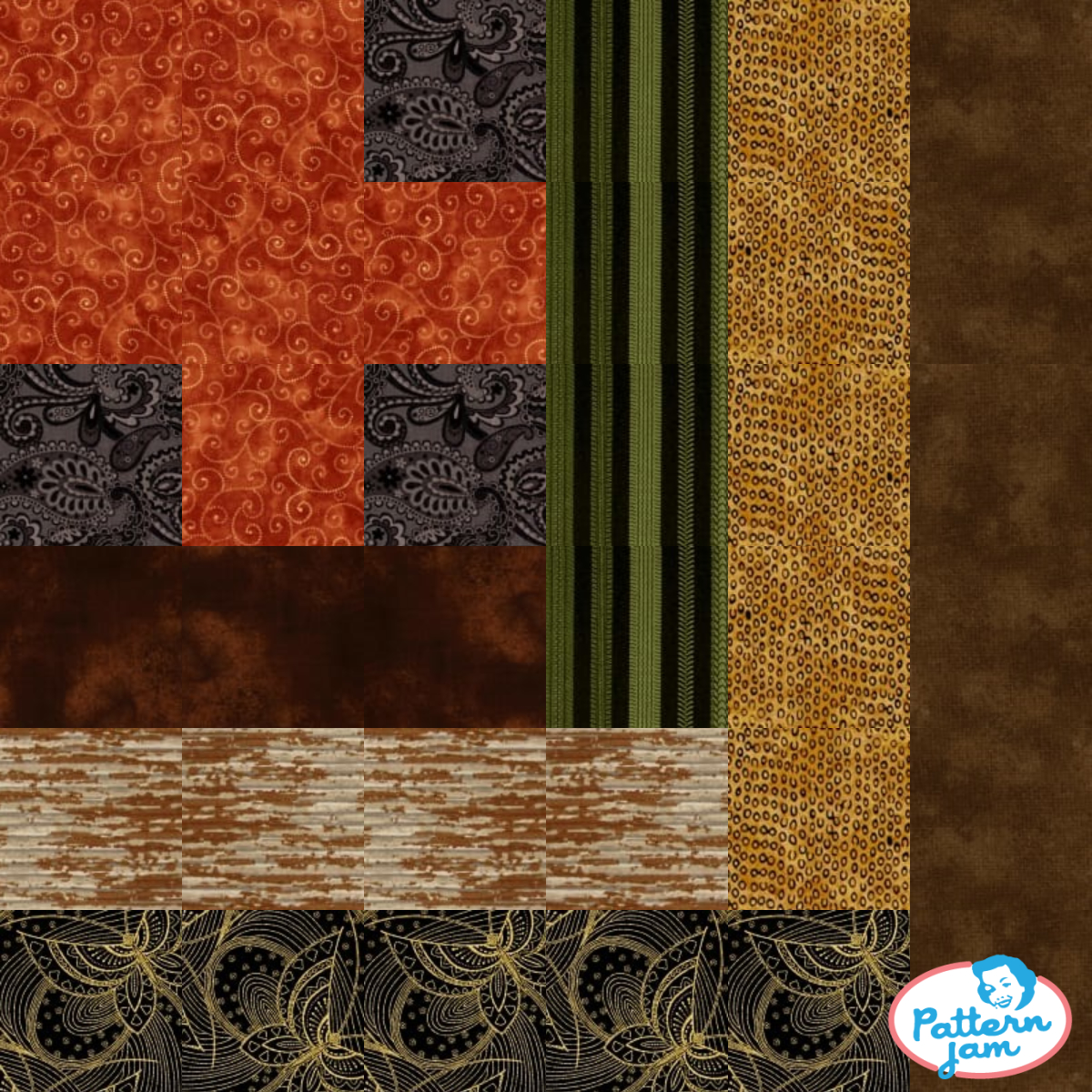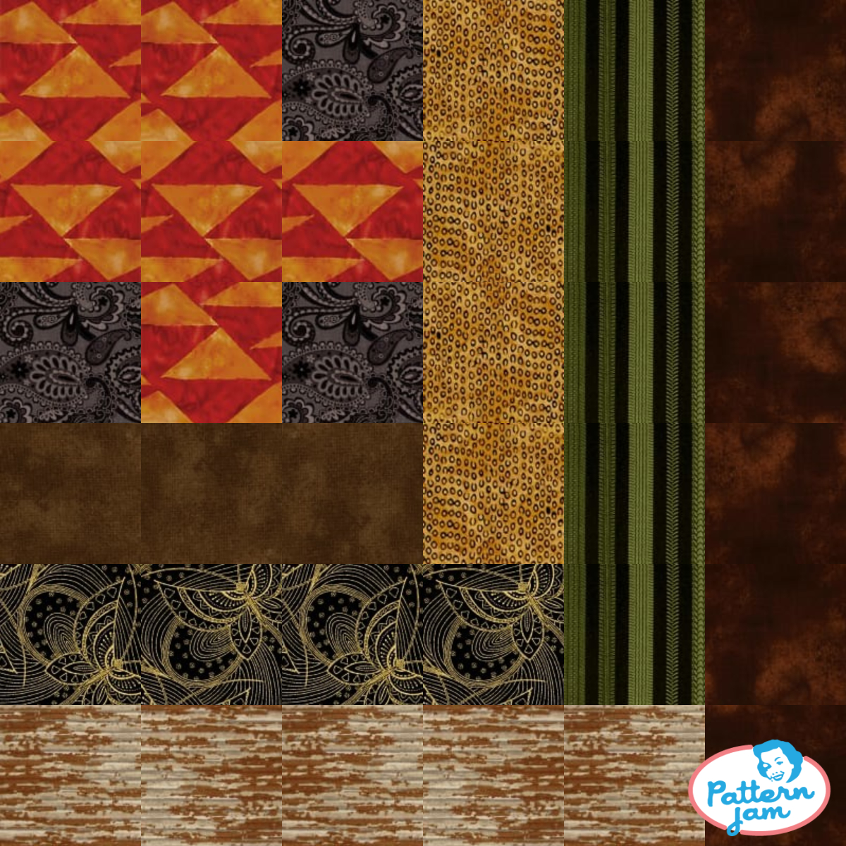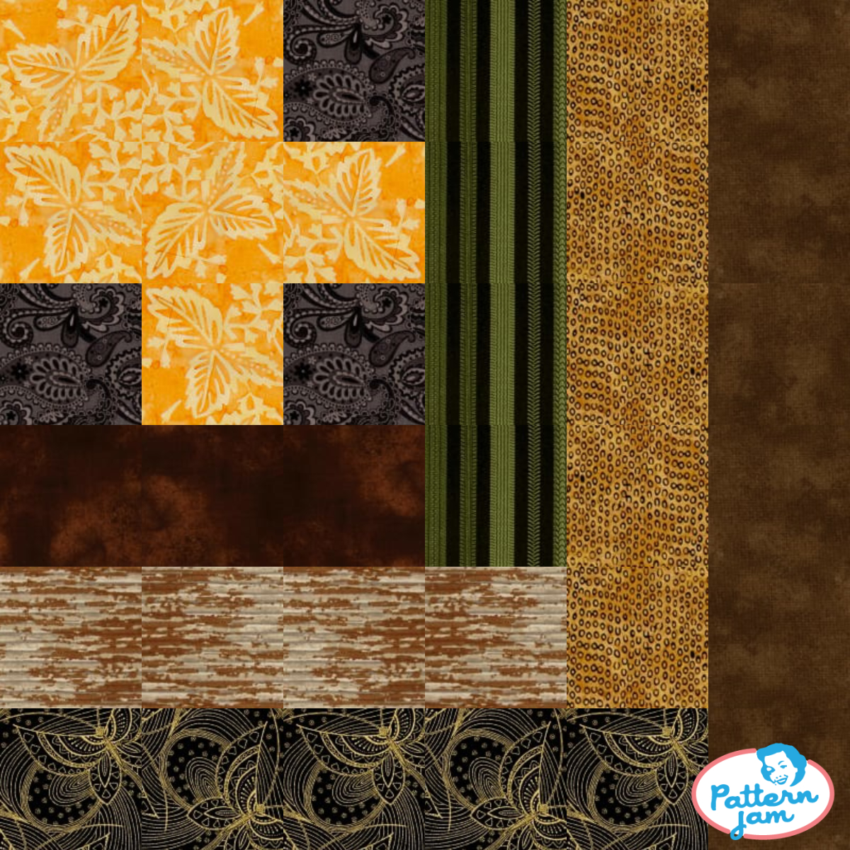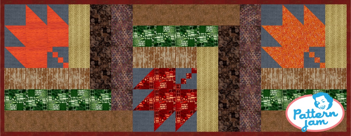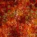Abstract falling leaves in red and orange tones against browns, greens, and golds