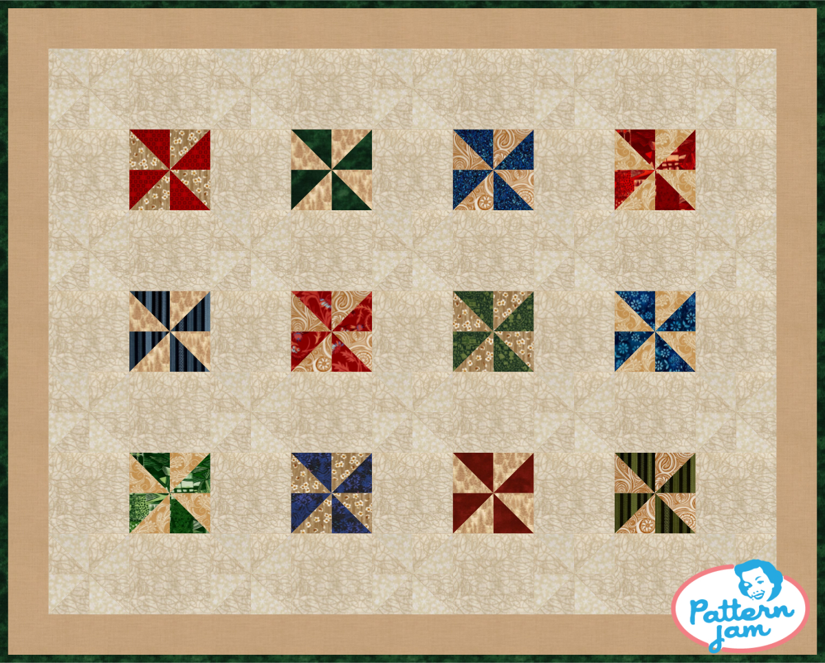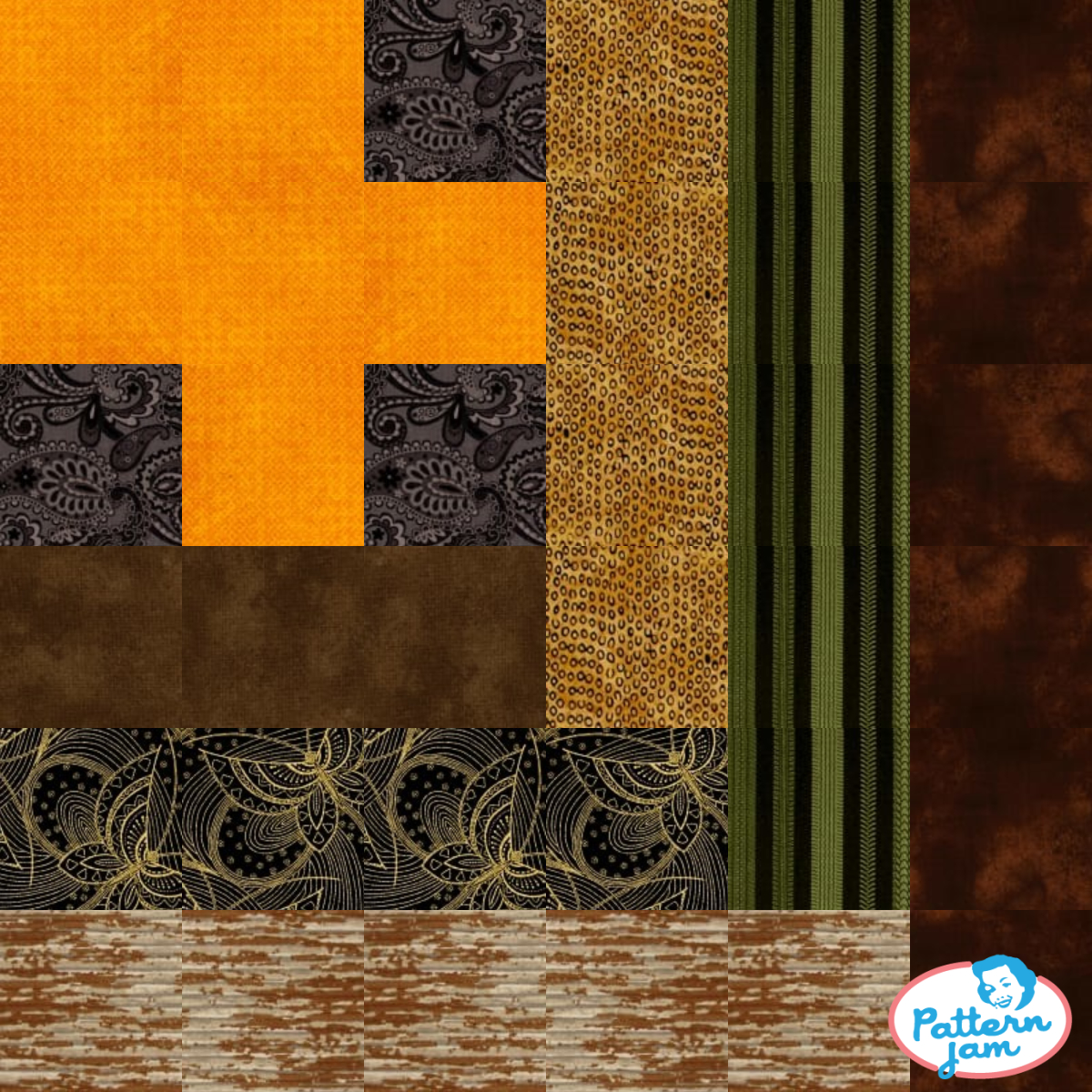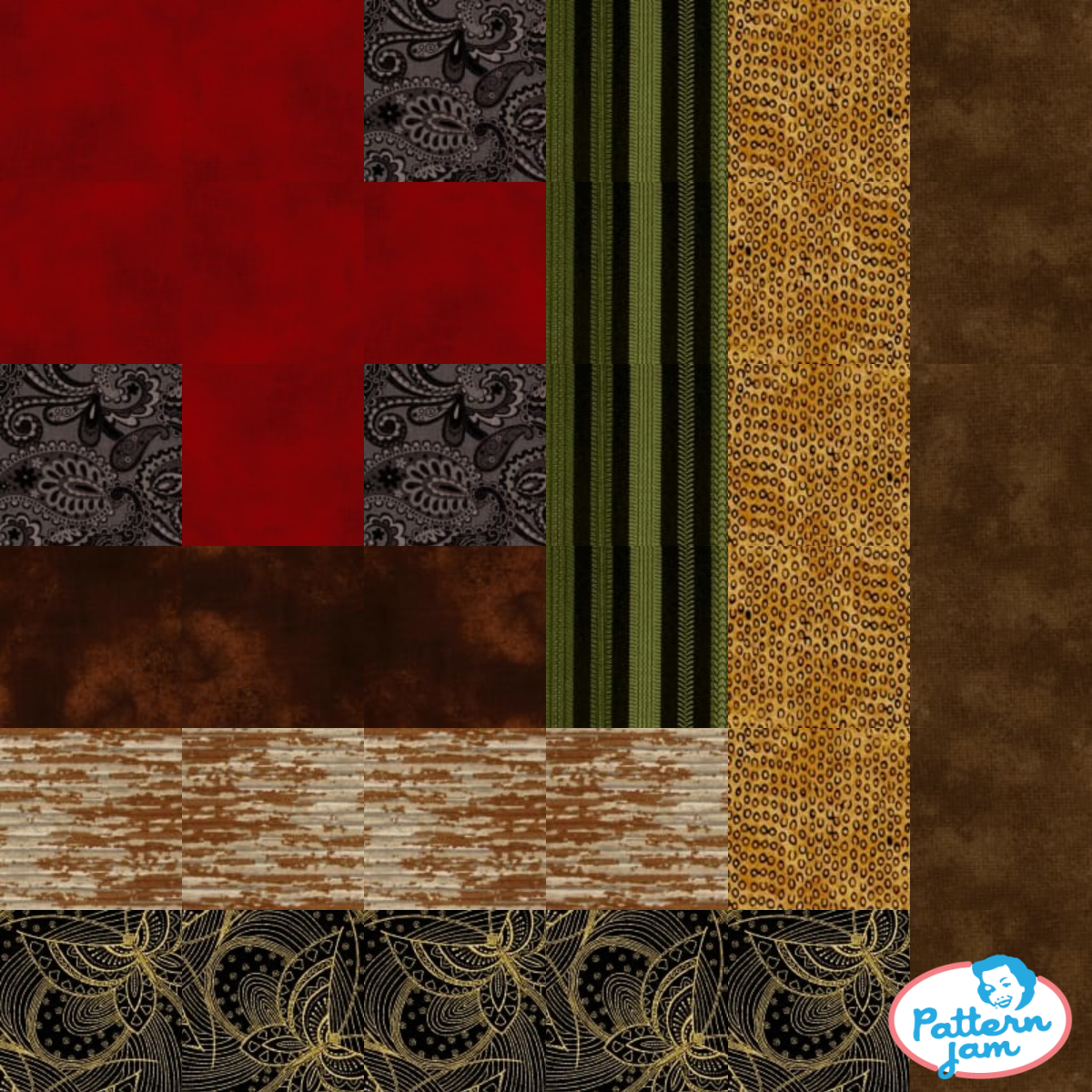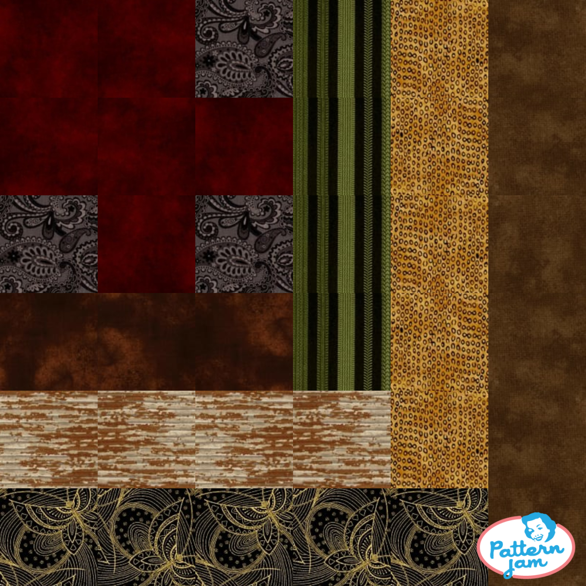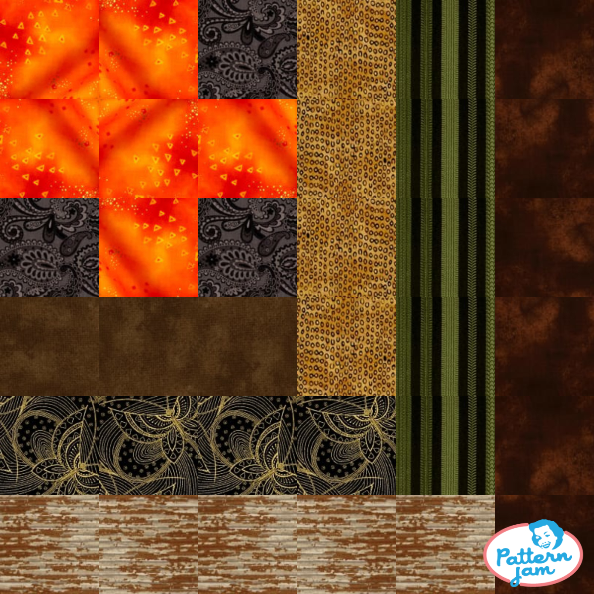 Abstract falling leaves in red and orange tones against browns, greens, and golds