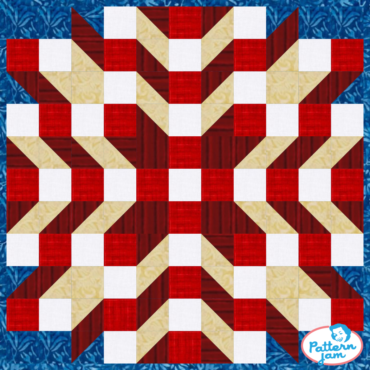 using 2 reds and 2 whites gives this a 3-dimensional effect. Easy and fast with Squares and 1/2 square triangles.