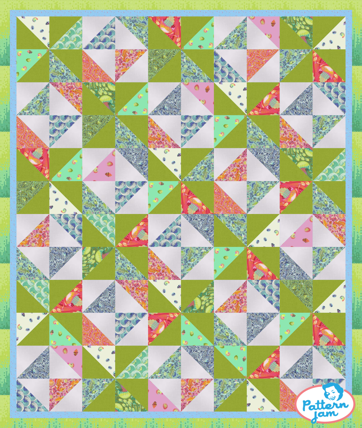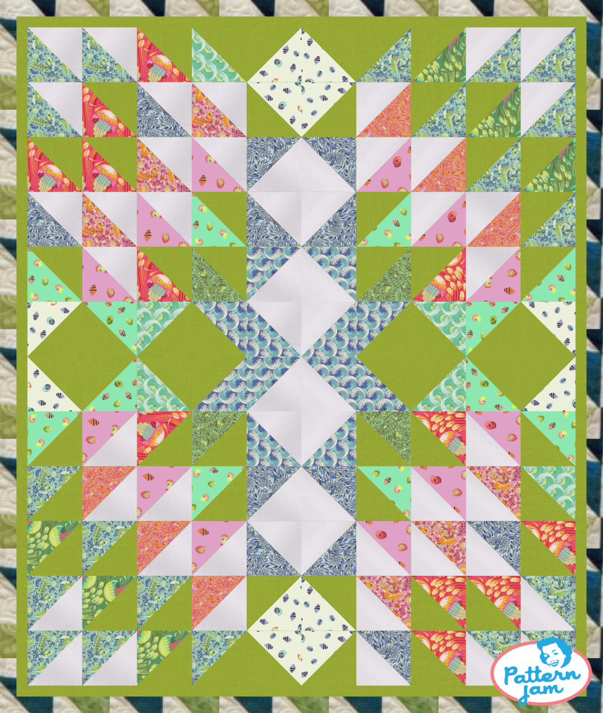 Beginner Quilt Class Mockup idea using an uneven number of HST combinations made from a Tula Pink Zuma fat quarter bundle. The border will be smaller HSTs from leftover fabric.